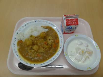 今日の献立は、カレーライス、フルーツのヨーグルトがけ、牛乳です。