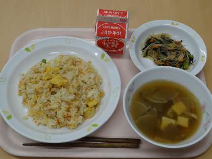 今日の献立は、高野豆腐のそぼろご飯、小松菜と春雨のサラダ、けんちん汁、牛乳です。