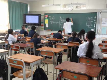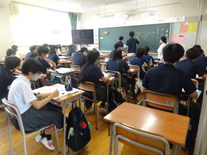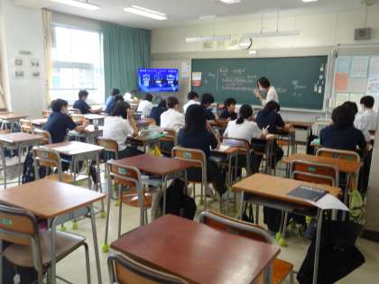 1校時の1年生は、数学(写真)、音楽、保健体育です。2年生は理科、英語(写真)です。3年生は国語(写真)、社会、美術です。