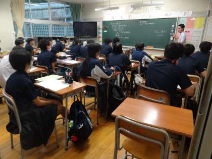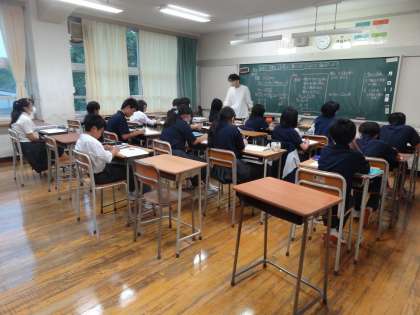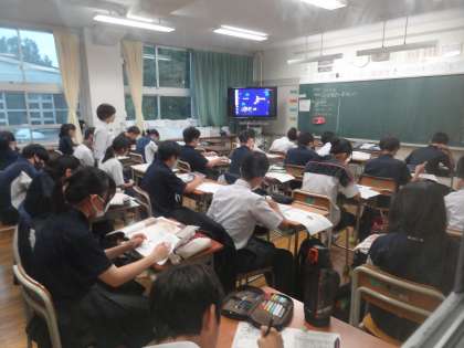 1校時の1年生は数学(写真)、理科です。2年生は社会(写真)です。3年生は国語、家庭科、理科(写真)です。