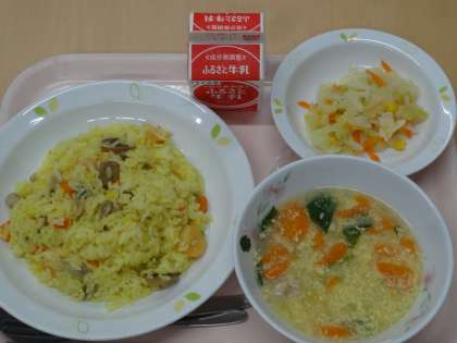 今日の献立は、パエリア風ピラフ、卵と青菜のスープ、コーンサラダ、牛乳です。