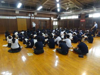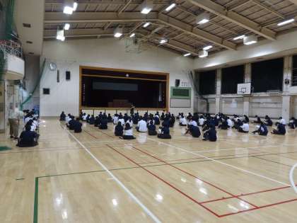 1校時の1年生は社会(写真)、音楽、保健体育です。2年生は職場体験前の学年集会(写真)です。3年生は修学旅行前の学年集会(写真)です。
