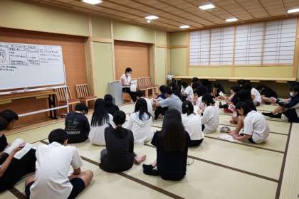 蒔絵体験の後、班長会です。寝るまでの確認、明日の行動についてしおりで確認しています。
