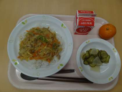 今日の献立は、スタミナ丼、きゅうりと大根の甘酢和え、冷凍みかん、牛乳です。
