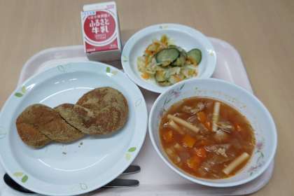 今日の献立は、揚げパン(きなこ)、ミネストローネスープ、フレンチサラダ、牛乳です。