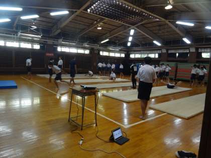 4校時の1年生は理科(写真)、英語、保健体育です。2年生は社会、保健体育(写真)、技術・家庭科です。3年生は数学、理科(写真)、技術・家庭科です。