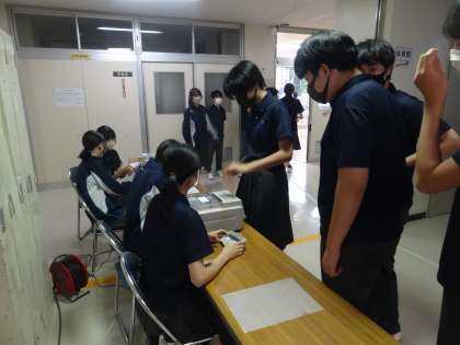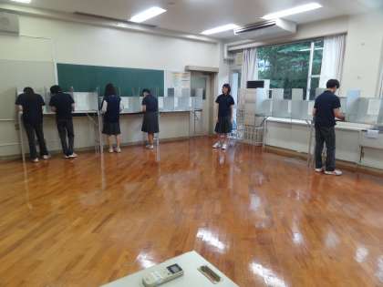 選挙管理委員の立会いの下、実際の選挙の投票所で使われている交付機で投票用紙をもらい、記載台で記入し、投票箱に投票用紙を入れる体験をしました。