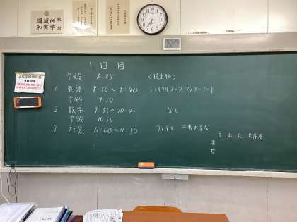 定期考査1日目です。教科は英語、数学、社会です。給食はありませんので、下校時刻は12時15分の予定です。
