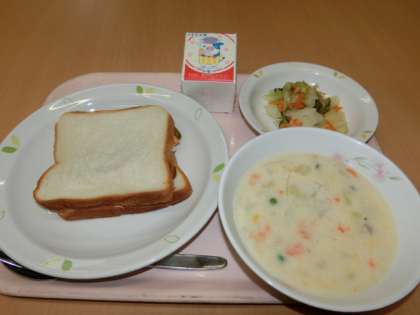 今日の献立は、ツナピザトースト、クリームシチュー、フレンチサラダと、牛乳です。