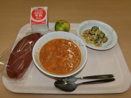 今日の献立は、米粉入りパン、ボルシチ、ビーンズサラダ、くだものと牛乳です。