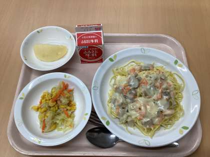 今日の献立は、スパゲッティクリームソース、コーンサラダ、りんご、牛乳です。