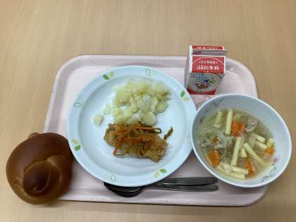 今日の献立は、黒砂糖パン、いかのマリネソースがけ、チーズポテト、マカロニスープ、牛乳です。