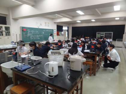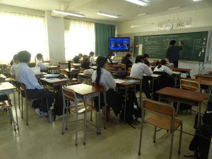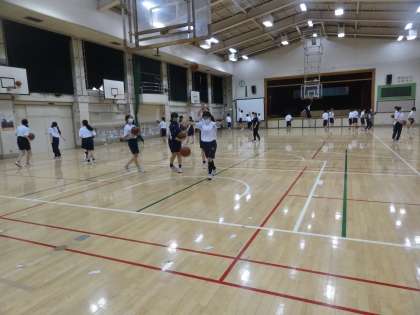 2校時の1年生は、比例のグラフ(数学・写真付き)、調理実習、固体の物質が水に溶ける様子(理科・写真付き)の授業です。2年生は、発表(英語)、合唱練習(音楽)の授業です。3年生は、バスケットボール(保健体育・写真付き)、人間と人工知能の創造(国語)、化学変化とイオンの実験(理科)の授業です。