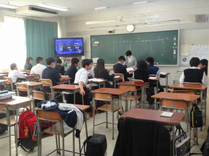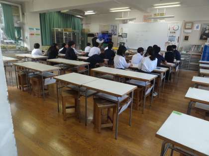 1校時の1年生は河口湖移動教室のしおり読み合わせをしています(写真)。2年生は学年集会の後学級活動です。3年生は学習習得確認調査(国語)をしています。
