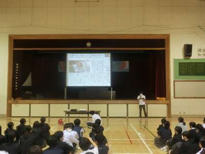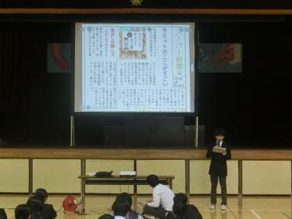 1校時に学年集会を実施しました。内容は、職場体験学習の事後学習として作成した、新聞を各学級の代表者が発表しました。3日間学んだことを上手くまとめ、発表できました。最後に、私からは合唱コンクールを振り返っての話をしました。行事の成果は、当日だけでなく、その後の生活に現れます。集団としての自分は、何ができるかを考え、一生懸命に頑張る。そのことが、応援される人、学年になることへ繋がります。また、皆さんの活躍を楽しみにしていますね。(第2学年主任 木村)