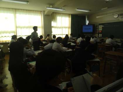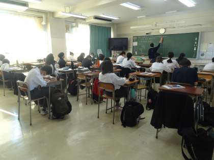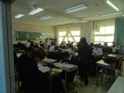 1校時の1年生の授業は、再結晶の実験後(理科)、反比例の表と式、グラフ(数学・写真付き)です。2年生は、江戸幕府滅亡に至る過程(社会)、接続詞thatの構文(英語・写真付き)、歌など(音楽)です。3年生は、太陽の一日の動きの観察(理科)、三権分立(社会)、人工知能との未来(国語・写真付き)です。