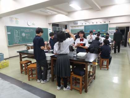 1校時の1年生の授業は、アジア州のまとめ(社会)、反比例のグラフ(数学)、水の中の様子について考える(理科・写真付き)です。2年生は、銅板レリーフ(美術・写真付き)、平家物語(国語)、Tボール(保健体育)です。3年生は、公職選挙法(社会)、古今和歌集(国語)、星の1日の動き(理科・写真付き)です。