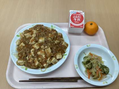 今日の献立は、マーボー麺、白菜の中華サラダ、みかん、牛乳です。