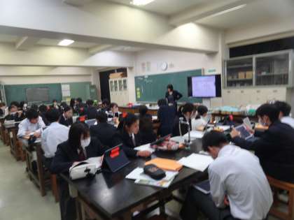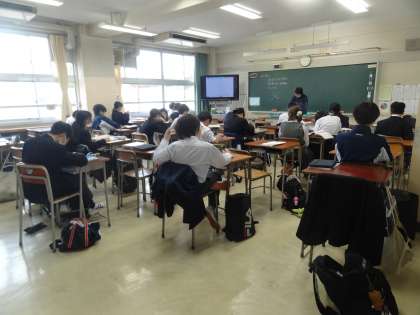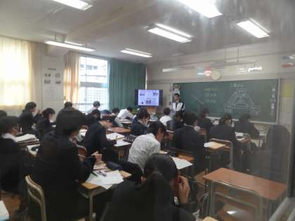 1校時の1年生の授業は、対称移動(数学・写真付き)、目のとどく光の道すじ(理科・写真付き)です。2年生は、富国強兵と文明開化(社会)、リコーダー(音楽)、疑問詞など(英語)です。3年生は、テストまとめ(理科)、奥の細道(国語)、三権分立(社会・写真付き)です。