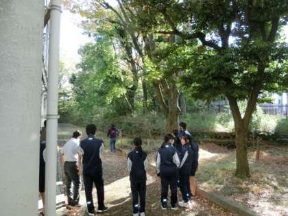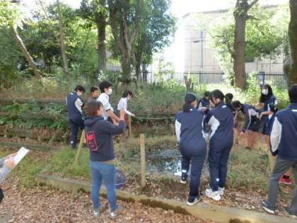 JRC部が、ビオトープの美化活動を行いました。池にたまった枯葉や周辺の枯れ枝を抜き、生き物たちにとって住みやすい環境づくりを行いました。