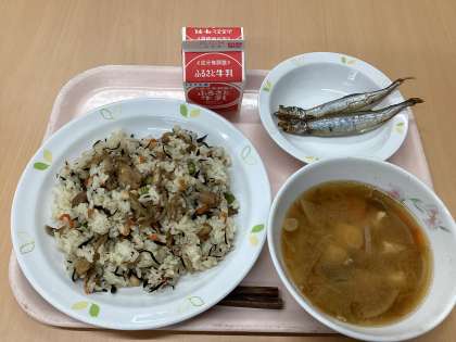 今日の献立は、大豆入りひじきごはん、焼きししゃも、豚汁、牛乳です。