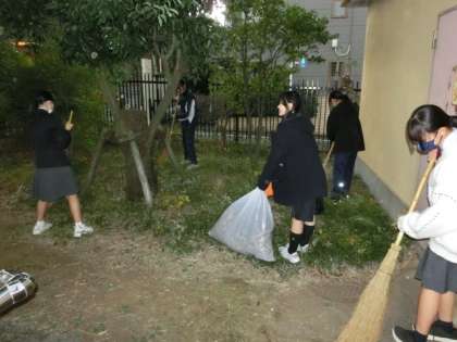 11月27日(月)・28日(火)の放課後、美化委員とJRC部員を中心に、タンチ山周辺の落ち葉掃きを行いました。参加生徒は、およそ80人。多くの生徒が協力し合い、楽しみながら落ち葉掃きをしていました。