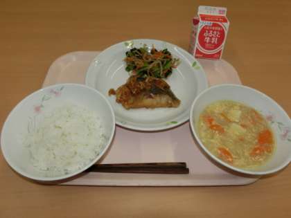 今日の献立は、ごはん(有機米)、あじの南蛮漬、ごま和え、中華風コーンスープと、牛乳です。