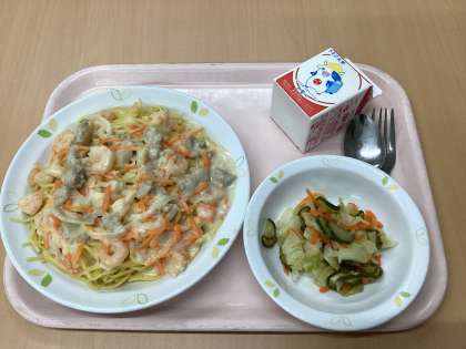 今日の献立は、スパゲッティクリームソース、フレンチサラダ、牛乳です。
