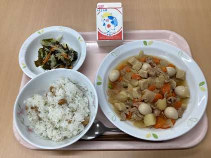今日の献立は、豆ごはん、肉じゃがうま煮、わかめサラダ、牛乳です。