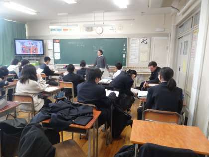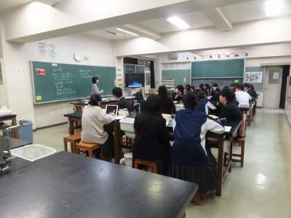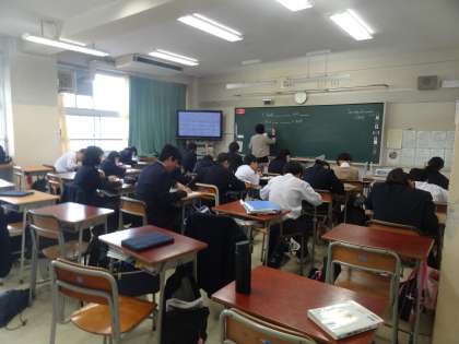 2校時の英語の授業では、現在進行形の学習で、ALTも入って英会話をしています。理科では、理科室にて音の性質について、実際に授業での音をタブレットに表示させながら授業を進めています。