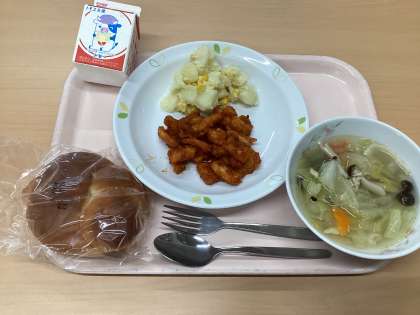 今日の献立は、ミルクパン、いかのケチャップ和え、コーンポテト、いなか風豆スープ、牛乳です。