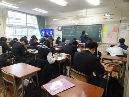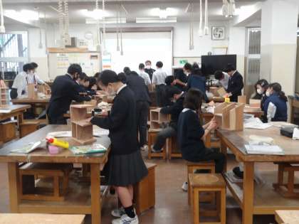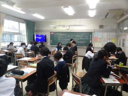 5校時の1年生の授業は、鑑賞(美術)、方程式の復習(数学)、ラックの製作(技術・写真付き)です。2年生は、近畿地方の産業と歴史(社会)、ダンス(保健体育)、立憲制国家の成立(社会・写真付き)です。3年生は、英単語を作ろう(英語)、弧と円周角(数学・写真付き)です。