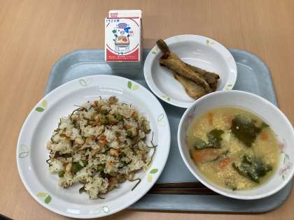 今日の献立は、昆布ごはん、小魚のから揚げ、かきたま汁、牛乳です。なお、本日は都合により果物の提供はできませんでした。