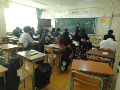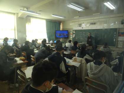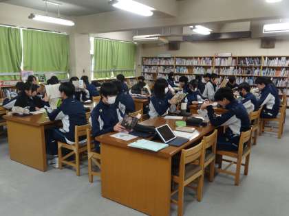 1校時の1年生の授業は、英語、リコーダー(音楽)です。2年生は、道管、師管(理科・写真付き)、近畿地方の産業(社会)、読書に親しむ(国語・写真付き)です。3年生は、英語、円の接線の作図方法(数学・写真付き)です。