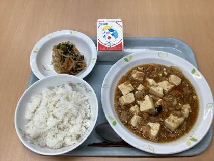 今日の献立は、麦入りごはん、麻婆豆腐、ナムル、牛乳です。