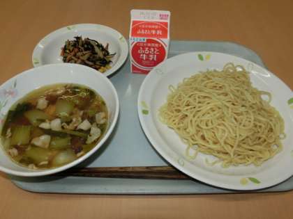 今日の献立は、つけしょうゆラーメン、満点サラダ、牛乳です。