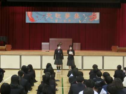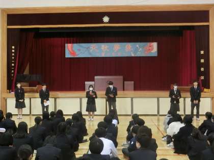 2校時に、2学期のまとめの学年集会を実施しました。内容は、学級委員からクラスの2学期の振り返り、生活・給食委員からタブレットの使用マナーについて、授業スタンダード強化週間の表彰、各先生方からのお話でした。いよいよ、冬休みが明けると3年生に向けての準備期間となる3学期がスタートします。少しずつ、そして着実に成長してきたこの間の集大成を3学期に繋げていきましょう。皆さんには、その力があると信じていますね。保護者の皆様、2学期においても日々の教育活動にご理解、ご協力を賜り心より感謝申し上げます。今後とも、どうぞよろしくお願いいたします。(第2学年主任 木村)