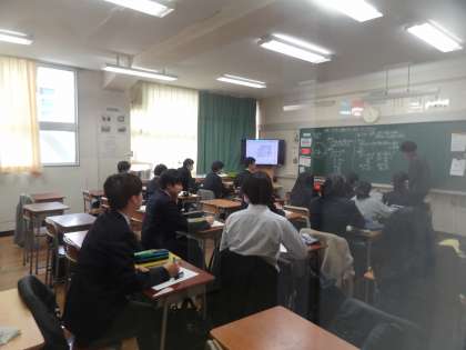 3校時の1年生の授業は、英語、理科、ミニ駅伝(保健体育・写真付き)です。2年生は、君は「最後の晩餐」を知っているか(国語)、バスケットボール(保健体育・写真付き)、家庭科です。3年生は、国語、2点間の距離や弦、接線の長さを求める(数学・写真付き)です。