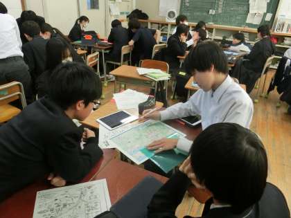 6校時の「総合的な学習の時間」では、鎌倉校外学習に向けて各班で当日に巡る見学先を検討しました。今回は、見学候補予定地の位置関係を把握し、移動時間や見学時間を含めて、どの程度時間を要するのか考えを深めていました。多くの生徒が「鎌倉」を訪れたことがない状況のため、今回の事前学習や当日の様々な見学を通して、古都・鎌倉の魅力を知ってほしいと思います。今後も、実りある学習となるよう、班員で協力して頑張りましょう。(第2学年主任 木村)