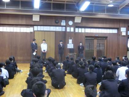 本日、学年朝礼を実施しました。内容は、鎌倉校外学習の実行委員長から意気込み、スローガンの紹介をし、その後各係長からの話がありました。スローガンは、「最高の思い出in 鎌倉」です。どのように準備から本番まで取り組むことが、「最高の思い出」に繋がるのか、個々が考え、行動することが大切です。それぞれが思い描く「最高の思い出」になるよう、尽力しましょう。(第2学年主任 木村)