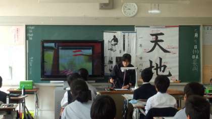 右の写真は、3年生社会(歴史的分野)です。実物投影機を使い、ワンポイントで年表を大きく映して確認したり、人物の顔を映して関心を高めたりして、効果的にICT機器を使っています。