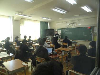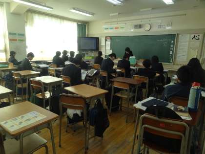 2校時の1年生の授業は、英語(写真付き)、書道、南アメリカ州(社会)です。2年生は、国語、日本の四季の特徴(理科・写真付き)、平面構成(美術)です。3年生は、社会、リコーダー(音楽)、受け身(保健体育)です。