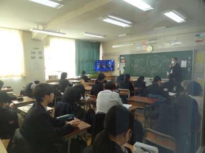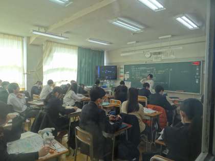 3校時の1年生の授業は、音楽、英語(写真付き)です。2年生は、格助詞(国語)、第一次世界大戦以後の国際関係(社会・写真付き)、保健です。3年生は、理科(写真付き)、国語です。