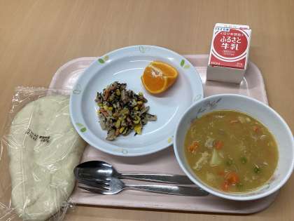 今日の献立は、ナン、カレーシチュー、ごぼう入りサラダ、はるみ、牛乳です。