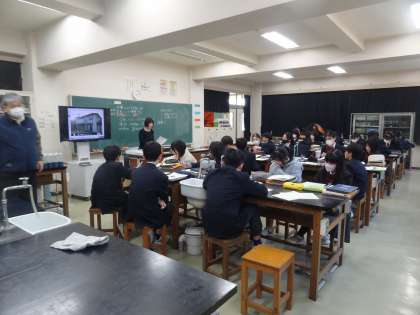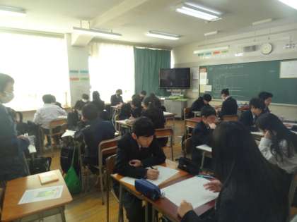 1校時の1年生の授業は、さいころの「3」の目の出やすさを調べる(数学・写真付き)、ことがらの起こりやすさについて(数学)、地震によって引き起こされる災害について(理科・写真付き)です。