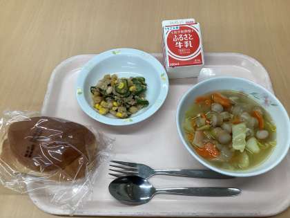 今日の献立は、ダイスチーズパン、ポトフ、ビーンズサラダ、牛乳です。