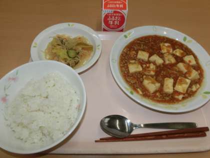 今日の献立は、ごはん(有機米)、麻婆豆腐、春雨サラダ、牛乳です。