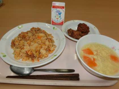 今日の献立は、キムチチャーハン、鶏のから揚げ、かきたま汁、牛乳です。