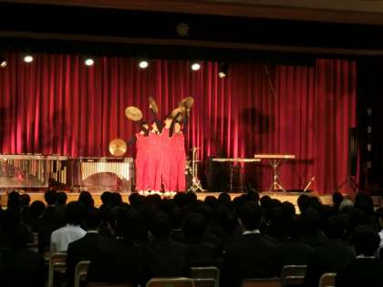 5,6時間目、プロのパフォーマーの皆さんによる、パーカッション・エンターテインメント「Funcussion(ファンカッション)」を、体育館で実施しました。