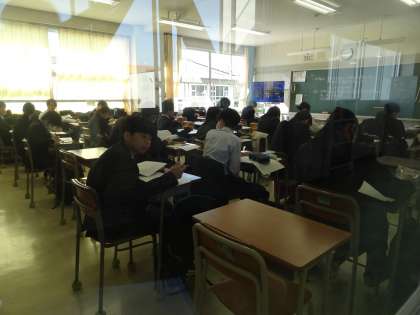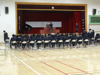 1校時の1年生の授業は、家庭科、保健(写真付き)、数学です。2年生は、国語、音楽、梅雨・台風(理科・写真付き)です。3年生は、卒業式練習(写真付き)です。